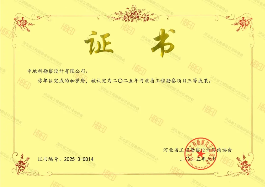 中地科勘察设计有限公司荣获2025年河北省工程勘察项目一项二等成果奖,二项三等成果奖!此次获奖是勘察公司多年来踏实专研工作的集中体现,这些奖项不仅是对公司过去工作的肯定,更是激励公司未来继续前行的动力源泉。在未来的发展道路上,将以获奖项目为标杆,持续深耕,创作更多高质量、高水平勘察设计成果,助力工程勘察设计行业高质量发展。